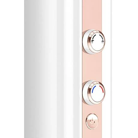 The stylish White and Rose Gold AQUAMAX Flex Shower is equipped with a Smart 200 overhead shower, 3 spray pattern hand shower and an easy to use control unit. There is a built-in pressure balance for a steady temperature.