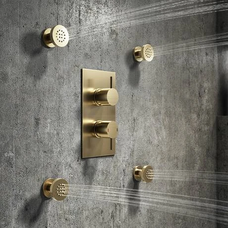 The Arezzo concealed thermostatic shower valve with built-in diverter features a striking round design with a contemporary brushed brass finish. Offers thermostatic showering via two easy-to-operate controls for temperature and flow.