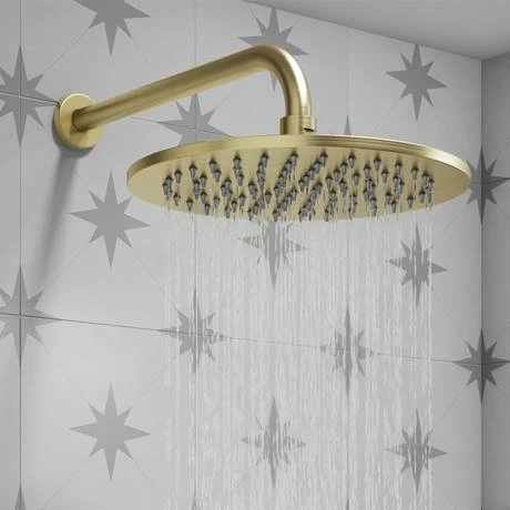 (1) Arezzo Round 300mm Brushed Brass Fixed Shower Head + Wall Mounted Arm