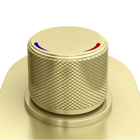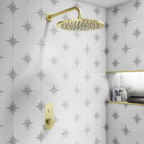 The stylish Arezzo industrial-style brushed brass 1 touch push button smart control shower package with 300mm wall mounted shower head is perfect for adding a striking finishing touch to your contemporary bathroom. Features easy to use instant 1 touch push button start/stop water flow activation. Temperature and flow is easily adjusted by simply turning the mixing valve. Crafted to the highest standards, this stunning shower valve features a round knurled textured tap head controls, perfect for creating an eye catching industrial look in your bathroom. Plated in a brushed brass finish which is highly resistant to corrosion. This ‘twin’ shower valve is perfect for installing in a concealed arrangement.Â