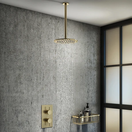 This Arezzo brushed brass round concealed thermostatic valve with it’s chic minimalist design will bring a touch of sophistication to any bathroom, offers thermostatic showering via two easy-to-operate controls for temperature and flow. Supplied with matching ceiling mounted brushed brass round fixed shower head with swivel joint and arm.
