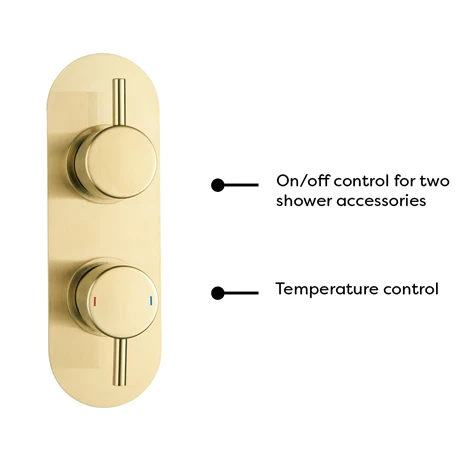 The Arezzo concealed thermostatic shower valve with built-in diverter features a striking round design with a contemporary brushed brass finish. Offers thermostatic showering via two easy-to-operate controls for temperature and flow. Valve has built-in diverter to switch between two different outlets i.e. fixed head/slide rail kit, fixed head/body jets or slide rail kit/body jets.
