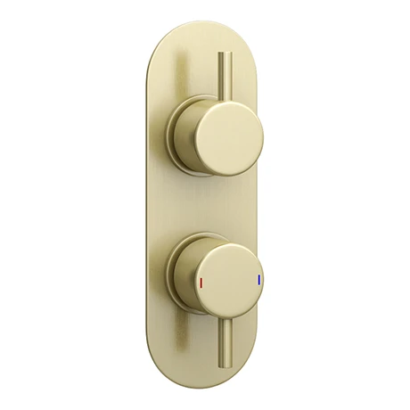 The Arezzo concealed thermostatic shower valve with built-in diverter and slim oval faceplate features a striking round design with a contemporary brushed brass finish. Offers thermostatic showering via two easy-to-operate controls for temperature and flow.