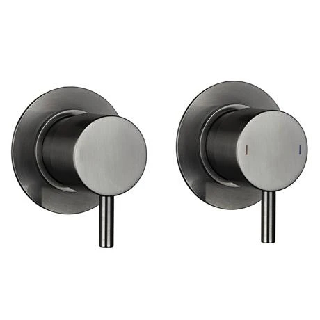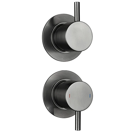The Arezzo Brushed Gunmetal Grey Concealed Individual Stop Tap and Thermostatic Control Shower Valve Pack features a minimalist round design. This modern shower valve pack is perfect for installing in a concealed arrangement, linked to a fixed shower head.Â