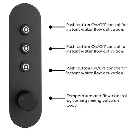 Bring elegance to the modern bathroom with this Arezzo Matt Black Industrial Style Push Button 3 outlet complete shower. The package includes a concealed push button shower valve with integrated diverter, handset, fixed overhead shower head and 4 round body jets. The stylish concealed shower valve offers thermostatic showering via three easy-to-operate controls, operates two shower accessories separately or simultaneously and diverts to a third option. The solid brass construction makes the valve durable and quick to clean thanks to the smooth finish. The ideal solution for multi-option showering.