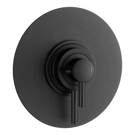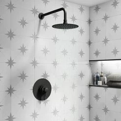 The minimalist Arezzo matt black thermostatic shower valve with round backplate offers thermostatic showering with two easy to operate controls, one operates flow control whilst the other allows temperature selection. Shower package comes with a 200mm fixed wall mounted shower head, this valve has the added safety benefit of a built in anti-scald device should the cold water supply fail. The matt black Arezzo dual concealed thermostatic shower valve pack adds a touch of sophistication and style in any bathroom.