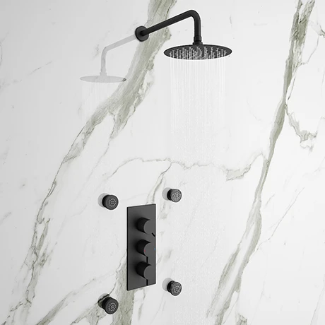 The on-trend Arezzo matt black round range brings substantial elegance to the modern bathroom. Package includes a concealed triple thermostatic shower valve, fixed shower head and 4 round body jets. The shower valve offers thermostatic showering via three easy to operate controls that give you power over temperature and flow. Triple shower valve operates two outlets separately or simultaneously (overhead shower head or body jets). The solid brass construction makes the valve durable and quick to clean thanks to the smooth finish. The ideal solution for multi-option showering.