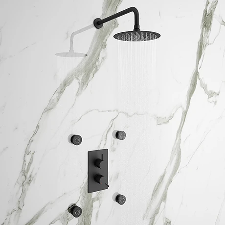 The on-trend Arezzo matt black round range brings substantial elegance to the modern bathroom. Package includes a concealed thermostatic shower valve with diverter, fixed shower head and 4 round body jets. The shower valve offers thermostatic showering via two easy-to-operate controls for temperature and flow, integrated diverter switches the water between two shower accessories (overhead shower head or body jets). The ideal solution for multi-option showering.