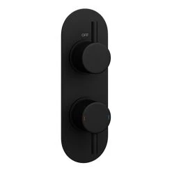 The Arezzo concealed thermostatic shower valve with built-in diverter and slim oval backplate features a striking round design with a contemporary matt black finish. Offers thermostatic showering via two easy-to-operate controls for temperature and flow.