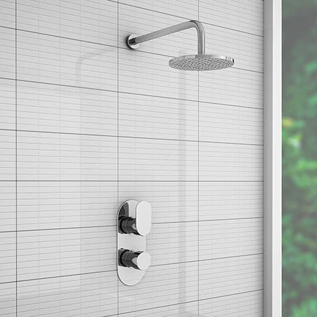 The wall mounted Bosa modern concealed one outlet shower package features minimalist round lever handles with a stylish matching curved back plate in chrome and a 200mm round rainfall type fixed shower head with arm.