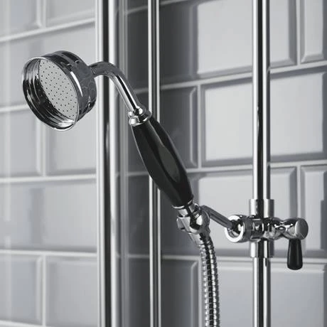 This Chatsworth 1928 black concealed push-button operated thermostatic valve pack with 2 outlets will compliment any traditional bathroom suite, this concealed shower valve offers thermostatic showering via simple push on/off flow controls giving you instant start/stop activation. Supplied with two traditional shower accessories (shower head and handset), the classic style of this concealed shower package adds a touch of sophistication and elegance to your bathroom.