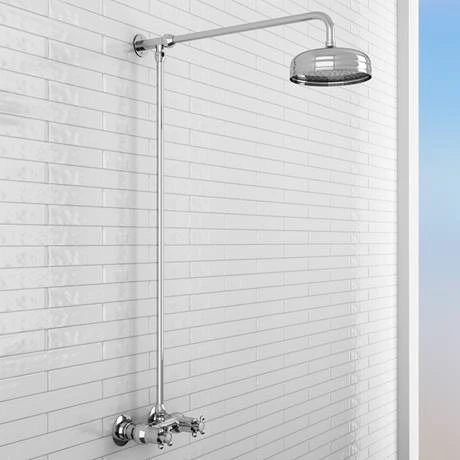 The Chatsworth Thermostatic Shower Bar Valve adds a classic twist to your bathroom or en suite. It’s manufactured from solid brass for long lasting use with a polished chrome plated outer that you can keep clean easily. A round shower head is attached to the thermostatic bar shower valve, creating a luxurious rainfall effect for your enjoyment. To control water temperature and flow, use the two sleek cross head handles that are easy to operate. This wall mounted rigid riser shower requires just one outlet, meaning it’s suitable for all plumbing systems.