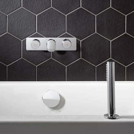 A modern design with geometric lines, the Dial Pier 2 Control Bath Valve with Handset and Bath Filler Waste features a brass body which has been engineered for maximum flow rate, the valve has 11 separate flow positions for complete showering flexibility whilst the built in thermostatic valve gives precise control of the temperature. This set includes a Follow Me handset and Mike Pro bath filler.