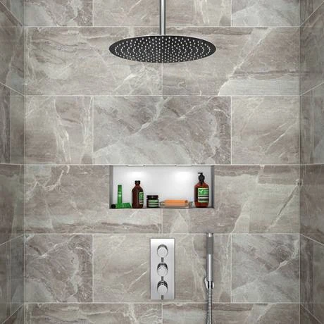 Enjoy versatile showering every single day with this Cruze Shower Package. Lather up under a luxurious rainfall fixed shower head then rinse using the handheld spray. Since there’s a separate knob for each, you can also use both at the same time. The 3 outlet shower valve plate features sleek round handles to provide a minimalist, modern look. You can mount these horizontally or vertically depending on your set up. The ceiling mounted fixed head and wall mounted pencil handset are easy to clean, even if you’re tackling limescale.