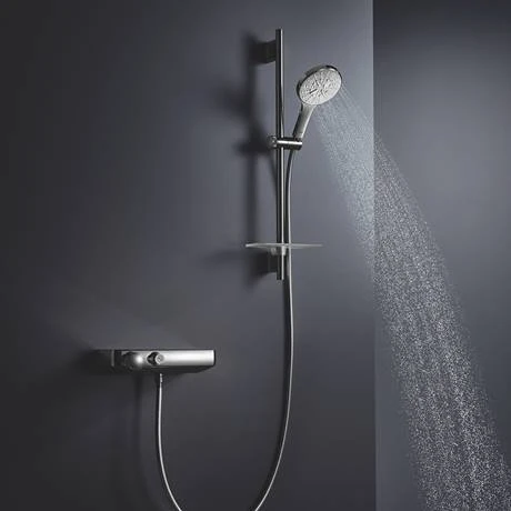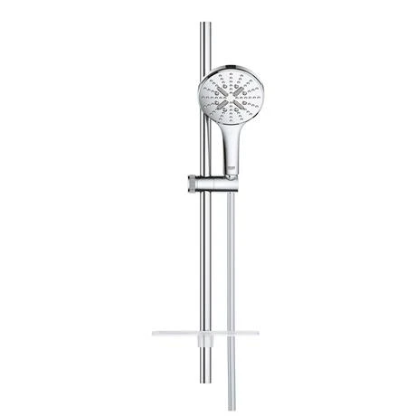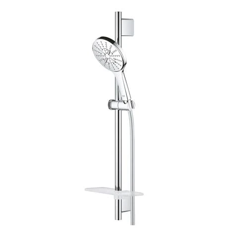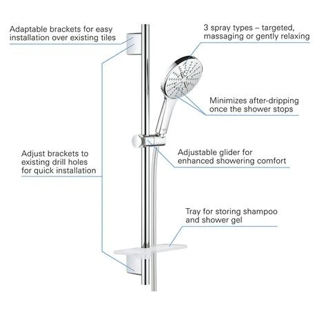 Why not give your shower an instant upgrade with the sleek and stylish GROHE Rainshower 130 SmartActive hand shower, which delivers modern design and performance. It comes with a 1750mm TwistFree Silverflex shower hose, 600mm matching rail and a GROHE EasyReach tray to organize your shower space. It is also packed with innovative technology. GROHE SmartTip β an ergonomic controller on the rear of the handle β gives you fingertip control of the spray pattern: pulsating GROHE ActiveMassage spray, which delivers a whole new level of revitalising massage power, invigorating Jet Spray and Rain Spray β as gentle as warm summer rain. When you turn the water off GROHE DripStop minimizes annoying drips from Rain and Jet spray. Thanks to GROHE DreamSpray, the flow from every nozzle has a perfectly balanced flow for maximum satisfaction, and the silicone anti-lime SpeedClean nozzles are extra easy to clean too. It also has GROHE EcoJoy, which limits water flow to 9.5 l/min but also delivers pure indulgence, and with a durable GROHE StarLight chrome finish it looks pristine for years. The Inner WaterGuide prevents the surface from getting too hot, protecting both your skin, and the sparkling chrome. Installation is incredibly easy too β the GROHE QuickFix Plus system ensures you can use existing holes while GROHE TileFix gives you the flexibility to alter the depth of each bracket to create a perfect fit, ideal for partially tiled bathrooms.
