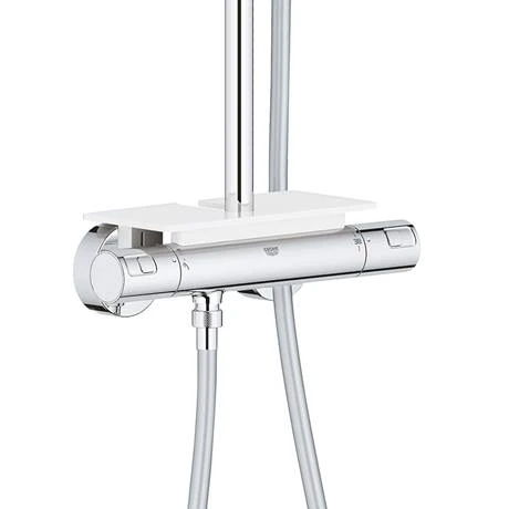 The GROHE Vitalio Start 210 shower system with thermostat adds instant designer style and performance to any bathroom. GROHE DreamSpray ensures the flow of water from every nozzle is even – perfect for the Vitalio Start 210mm head shower’s soothing Rain Spray. The 390mm arm of the head shower even swivels through 180° for added flexibility. The new Vitalio Start 100mm hand shower has a 1750mm TwistFree hose and two sprays to suit your mood: a soothing Rain Spray and the revitalising Jet Spray. Innovative GROHE EcoJoy technology limits water flow in both the head and hand shower – to 9.5l/m and 5.7l/m – but still guarantees complete showering satisfaction.