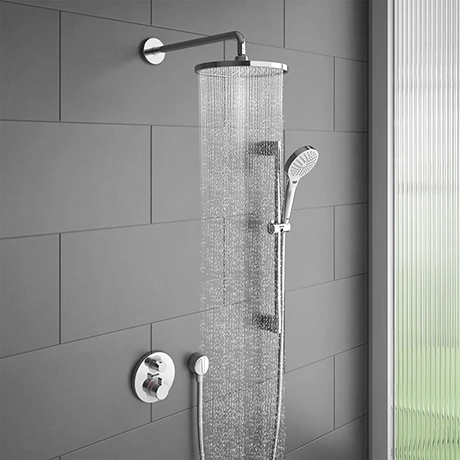 Upgrade your shower experience with this hansgrohe Ecostat Complete Shower Set with Slider Rail Kit. The fixed rainfall shower head adds a luxury feel, while the practical handset offers three different spray functions to suit your preference. Both are easy to operate thanks to the two intuitive dial controls. The adjustable temperature limit enables you to set a safety lock for peace of mind when kids are showering and the slider rail means you can easily adjust the height of the handset too. The QuickClean silicone nozzles also make it easy to remove limescale with just a quick rub.