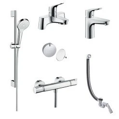 This hansgrohe over bath taps and shower package offers an economical way of adding designer elegance to your bathroom at an attractive price. This complete bundle comprises of a mono basin tap with waste, single lever bath filler, thermostatic bar valve with shower slider rail kit and pop up bath waste.