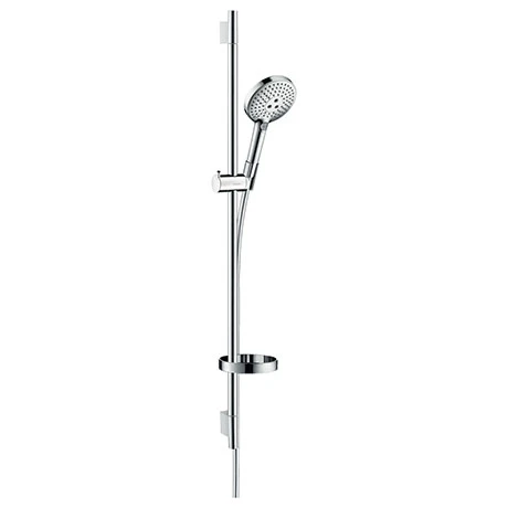This Raindance Select S complete shower slider rail kit consists of a 3-spray hand shower, 90cm shower bar, 1.6m shower hose, slider and soap dish. The hand shower can easily be adjusted to whatever height you need. If required, you can move the shower into the correct position by tilting and turning.Â