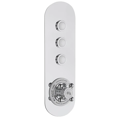 The Hudson Reed Topaz traditional three outlet push button shower valve is robust and graceful with the precision of modern day design. Its distinct ceramic control dial brings substantial elegance to the modern bathroom. Suitable for all types of plumbing installation this shower valve has the added safety benefit of a built in anti scald device should the cold water supply fail.Â