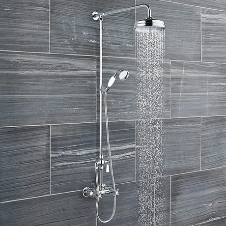 Complete your traditional bathroom with this timeless complete shower kit from Hudson Reed. Comprising of a thermostatic bar valve and rigid riser kit with a luxury 8″ round rainfall showerhead and single spray handset. The built-in diverter allows you to switch between the fixed head or handset. Manufactured from durable brass with a polished chrome finish for an added touch of style.