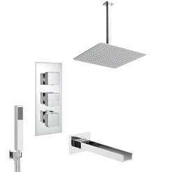 The minimalist Milan shower package, this quality shower comprises of a triple concealed thermostatic shower valve with built-in diverter, ultra sleek ceiling mounted rain effect fixed shower head, shower handset and a wall mounted waterfall bath spout.