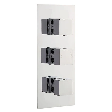 The stylish minimalist square triple concealed thermostatic shower valve from Nuie is a luxury showering product complete with diverter. Suitable for all types of plumbing installation this shower valve has the added safety benefit of a built in anti scald device should the cold water supply fail. Operates two shower accessories separately or simultaneously and diverts to a third option: fixed head & slide rail kit, fixed head & body jets or slide rail kit & body jets with option to divert to freeflow bath filler.